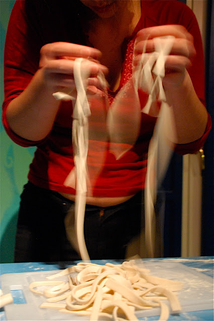 二十分鐘後,將麵糰取出,開始用木棍壓麵糰,至成長方型,這個過程很講究腕力和經驗,因此要重復練習。麵糰成長型後,對摺兩次,用菜刀切出麵條。將麵條放入熱水裡煮五至十分鐘,視乎厚度,即成。